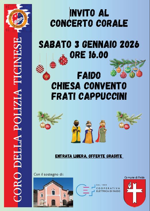 09/12/202510/12/2025 Marco MorandiConcerti Sabato 3 gennaio 2026 ore 16:00 Faido -Chiesa convento frati cappuccini Coro Della Polizia Ticinese
